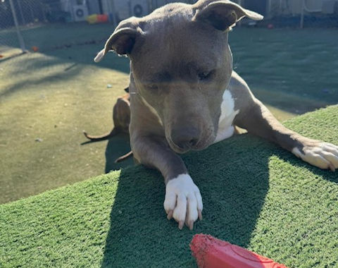 Waffles is a 70-pound silver pitbull mix with the heart of a teddy bear. His story began with heartbreak—he and his sister Genesis were found keeping watch by their owner, who had passed away outside of his tent. Since then, Waffles has been in foster care, patiently waiting for a new chapter to begin.
